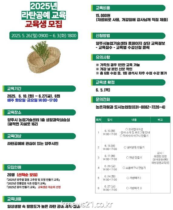 참가자는 교육비 일부로 자부담금 1만5천원을 납부해야 하며, 신청은 5월 26일(월) 오전 9시부터 6월 3일(화) 오후 6시까지 양주시 농업기술센터 홈페이지 상단 ‘교육정보’에서 선착순으로 접수할 수 있다.