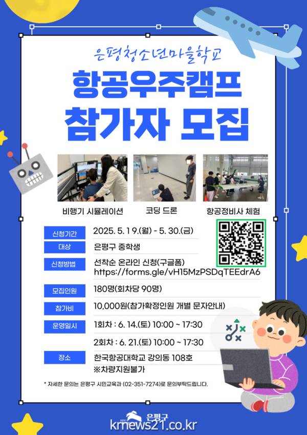 서울 은평구(구청장 김미경)는 항공우주분야에 관심있는 중학생을 대상으로 ‘은평항공우주캠프’를 운영하고 오는 30일까지 참가자를 모집한다고 밝혔다.