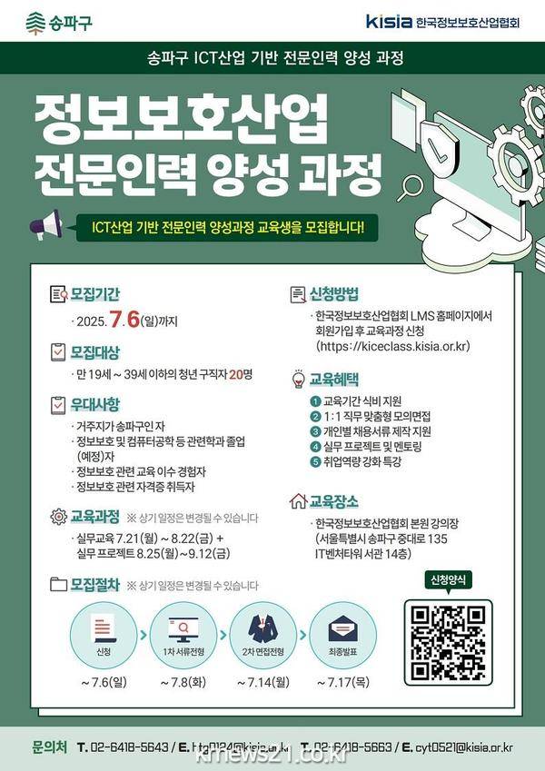 먼저, 최근 기관·기업 등에서 정보보호에 대한 일자리 수요가 급증함에 따라 ▲'정보보호산업 전문인력 양성과정'을 마련했다.