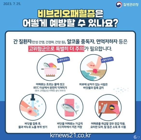 비브리오패혈증 예방을 위해 ▲어패류 손질 시 장갑 착용 ▲조리도구 사용 전후 소독 ▲어패류 저온 보관 ▲수돗물로 깨끗이 세척 ▲85℃ 이상 충분히 가열 섭취 ▲상처 난 피부는 노출되지 않도록 주의해야 한다.
