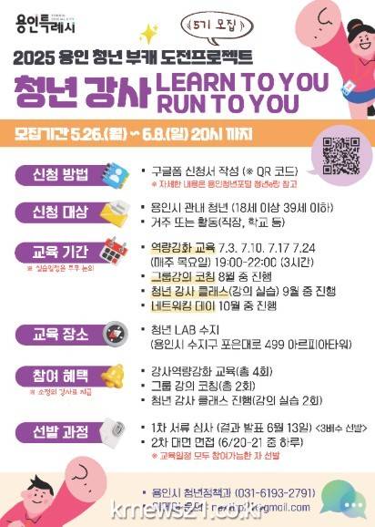 신청은 용인청년포털 ‘청년e랑’에서 확인하고, QR코드 온라인 링크를 통해 제출하면 된다. 서류심사와 면접심사를 거쳐 합격자는 6월 25일 개별통보한다.