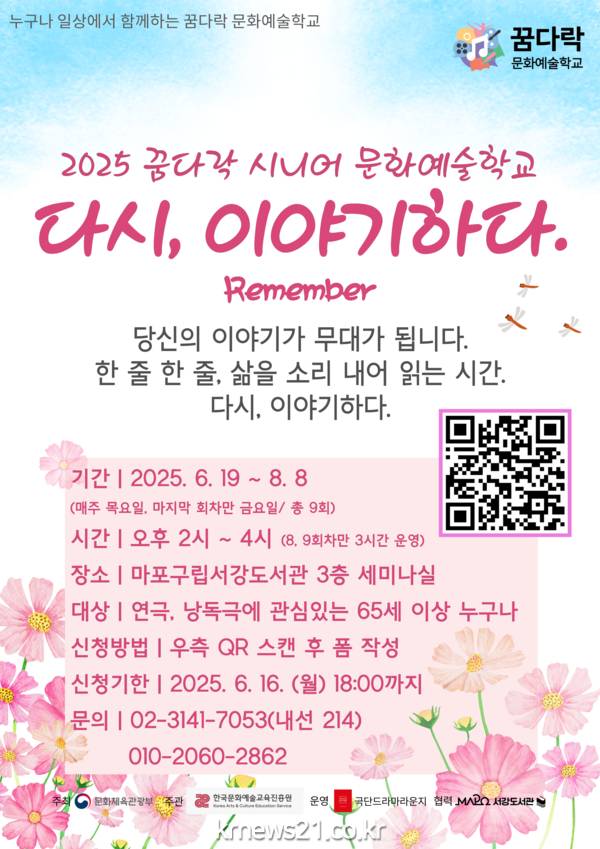 마포구(구청장 박강수)의 마포구립서강도서관(이하 서강도서관)은 인생의 후반전을 더욱 빛나게 할 연극 프로그램인 ‘다시, 이야기하다 remember(리멤버)’에 참여할 65세 이상 어르신을 6월 16일까지 모집한다.