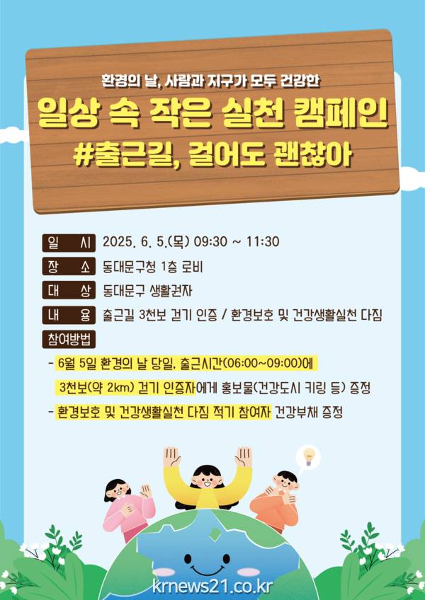 이번 캠페인은 6월 5일 오전 9시 30분부터 11시 30분까지 동대문구청 1층 로비에서 동대문구 생활권자를 대상으로 ‘출근길, 걸어도 괜찮아’를 주제로 열린다. 참가자는 출근길에 3000보(약 2km 거리 도보)를 걷고 인증하면 동대문구 대표 캐릭터 ‘디디미’ 열쇠고리를 받을 수 있다. 또한 환경 보호와 건강한 생활 실천에 대한 다짐을 포스트잇에 적어 게시하면 ‘건강부채’도 함께 제공된다.