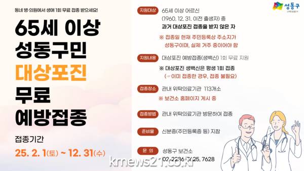 이에 구는 65세 이상 주민에게 대상포진 생백신 생애 1회 무료 접종을 지원하고 있다. 대상자는 성동구에 주민등록을 두고 실제 거주하는 65세 이상(1960년 12월 31일 이전 출생자) 대상포진 접종 이력이 없는 어르신이다.