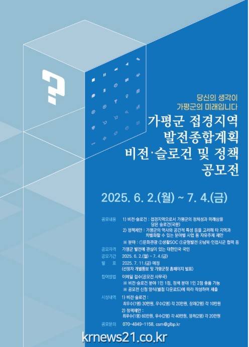 가평군은 이번 공모전을 통해 군의 미래 비전과 정책 방향에 대한 다양한 의견을 수렴할 계획이다. 전문가의 창의적인 아이디어를 군정에 반영해 접경지역으로서의 정체성을 살리고, 지속 가능한 발전 전략을 마련한다는 목표다.