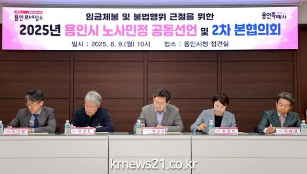 ▲ 사진=용인특례시용인특례시(시장 이상일)는 9일 시청 접견실에서 ‘임금체불 및 불법행위 근절’을 주제로2025년 노사민정 공동선언 협약을 체결하고, 노사민정협의회 본협의회를 개최했다.