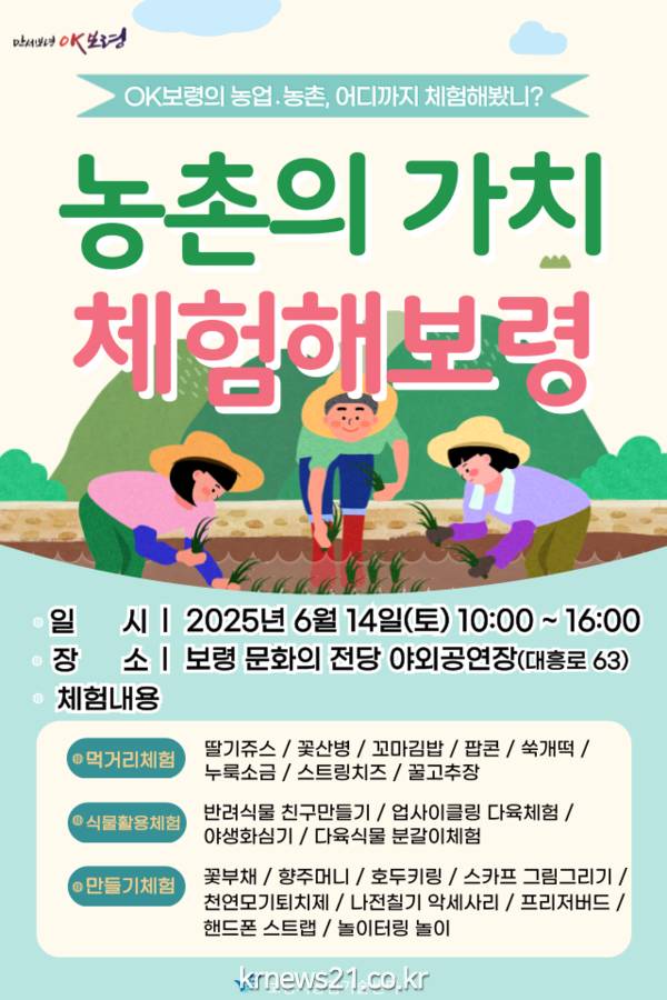 보령시는 6월을 맞아 ‘농촌의 가치, 체험해보령’ 행사를 오는 14일에 문화의 전당 야외공연장(대흥로 63)에서 오전 10시부터 오후 4시까지 개최한다고 밝혔다.