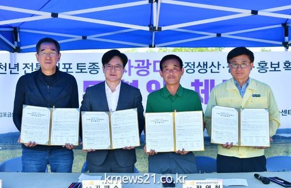 <</span>사진설명>김포시는 지난 12일 대곶면 약암리 874번지에 위치한 농업기술센터 벼 병해충 예찰실증포에서 김포시와 쌀전업농김포금쌀연구연합회, 김포고촌농업협동조합, (재)김포문화재단 등 4개 기관 관계자 등 40여명이 참석한 가운데 김포 토종벼인 ‘자광미’의 안정적 재배와 수매 및 판매, 홍보 및 문화예술활동 전개, 소득화 활성화 지원 등 업무협약을 체결했다.