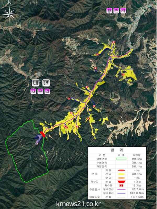 ○ 2030년까지 총 391억 원을 투입해 ▴저수지 1개소 ▴이설 도로 1.5km ▴용수로 15.5km를 설치하여, 총 281.1ha의 농지에 안정적인 용수를 공급할 예정이다.