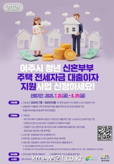 신청대상은 공고일(7/25) 1개월 이전 여주시에 주민등록을 둔 부부로서 혼인신고 후 10년 이내 무주택 신혼부부로 부부 중 1명 이상이 18세 이상 ~ 39세 이하의 청년에 해당하여야 하며, 세대원 합산 연소득이 8천만원 이하, 전세가액 3억원 이하, 세대구성원 전원 무주택자로서 금융권(제1·2금융권)을 통해 주택 전세자금을 대출받은 경우 신청이 가능하다.
