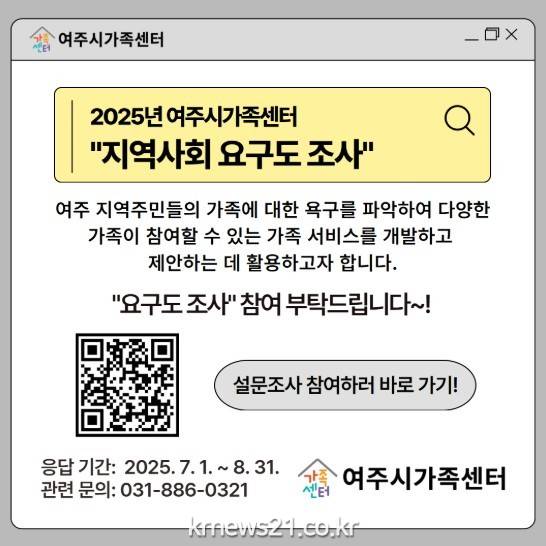 이번 조사는 여주시에 거주하는 시민들을 대상으로 다양한 가족 형태를 고려한 가족의 욕구와 생활 실태, 필요한 서비스 유형 등을 파악하고자 기획됐다. 조사는 2025년 7월부터 8월까지 약 두 달간, 총 500명을 대상으로 진행되며, 서면 설문지 또는 온라인 설문지를 통해 실시된다.