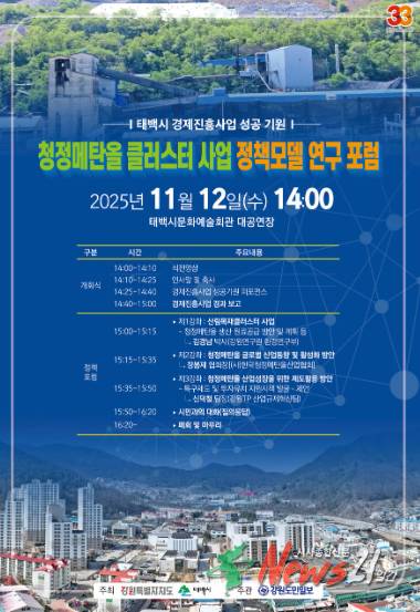 태백시(시장 이상호)는 오는 11월 12일 오후 2시 강원특별자치도와 공동으로 추진하는 ‘2025 국제 폐광지역 경제포럼’ 연계행사인 ‘청정메탄올 클러스터 사업 정책모델 연구 포럼’을 문화예술회관 대공연장에서 개최한다고 밝혔다.