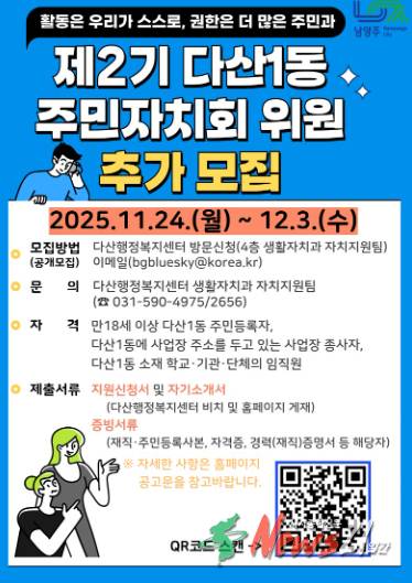 ▲ 사진=남양주시청남양주시(시장 주광덕)는 11월 24일부터 12월 3일까지 다산행정복지센터(센터장 이기복)가 ‘다산1동 제2기 주민자치회’ 위원 10명을 추가 공개 모집한다고 밝혔다.