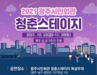 광주광역시는 광주청년센터와 함께 22일부터 11월20일까지 한달간 ‘2021 청년뮤지션 공연활동 지원사업 ‘청춘 스테이지 in 시민회관’을 진행한다.‘청춘 스테이지 in 시민회관’은 코로나19로 공연예술 활동이 중단되거나 축소돼 경제적 어려움에 처한 관내 청년 예술인들을 돕고 시민들에게 문화 콘텐츠를 제공하기 위해 추진하는 사업이...