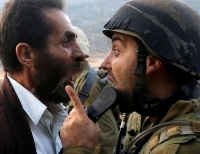 이스라엘 점령 지역인 서안지구의 나블루스 인근에서 이스라엘이 파키스탄인 학교 폐쇄를 명령한 후 한 팔레스타인 남성이 이스라엘 병사와 언쟁을 벌이고 있다.