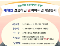 담양군(군수 정철원)은 2026년 새해를 맞아 오는 1월 26일부터 2월 8일까지 온라인 걷기 챌린지 ‘새해엔 건강하단 말이야’를 운영한다고 밝혔다. 이번 챌린지는 스마트폰 애플리케이션 ‘워크온(Walk ON)’을 활용한 온라인 참여 방식으로 진행된다. 참여 방법은 스마트폰 플레이스토어 또는 앱스토어에서 ‘워크온’ 앱(APP)을 설치하고 ...
