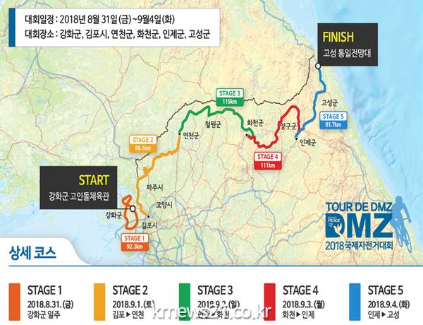 남북정상회담과 북미정상회담 개최 등 한반도 평화 분위기가 무르익는 가운데, 평화와 젊음의 축제로 자리매김한 ‘뚜르 드 디엠지(Tour de DMZ) 2018 국제자전거대회’가 8월 31일부터 9월 4일까지 5일간의 일정으로 비무장지대(DMZ)와 접경지역 일원에서 열린다.