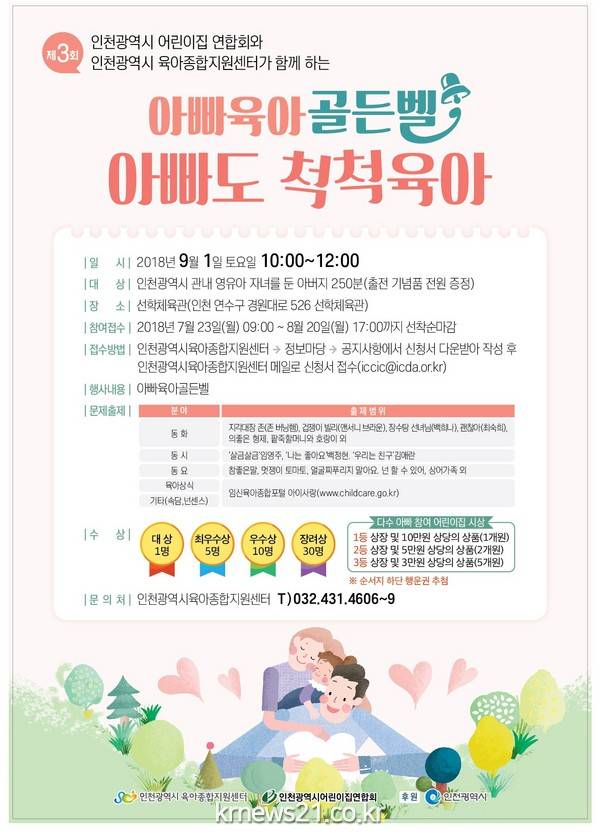 인천광역시는 육아종합지원센터 주관으로 9월 1일(토) 선학체육관에서 관내에 거주하는 영유아자녀를 둔 아버지 250여명(약1,000여명)이 참여하는 아빠 골든벨 “아빠도 척척육아”행사를 개최한다.