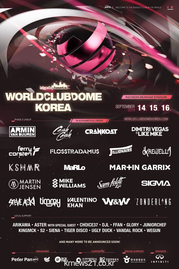 오는 9. 14(금)~16(일)까지 3일간, 문학경기장에서 개최되는“월드클럽돔 코리아”는 지난달 31일 2017년 디제이 세계랭킹 1, 2, 3위인 마틴 게릭스(Martin Garrix), 디미트리 베가스 & 라이크 마이크(Dimitri Vegas & Like Mike), 아민 반 뷰렌(Armin Van Buuren)을 비롯하여 국내에서 큰 인기를 모으고 있는 캐쉬 캐쉬(Cash Cash), 더블유&더블유(W&W), 킹맥(Kingmck)등 정상급 디제이들이 최종라인업과 스테이지별 출연진, 프로그램을 발표하며 팬들의 기대를 높이고 있다.