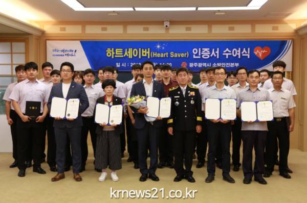 광주광역시 소방안전본부는 비즈니스룸에서 하트세이버(Heart Saver) 명예표장 및 인증서 수여식을 개최했다.