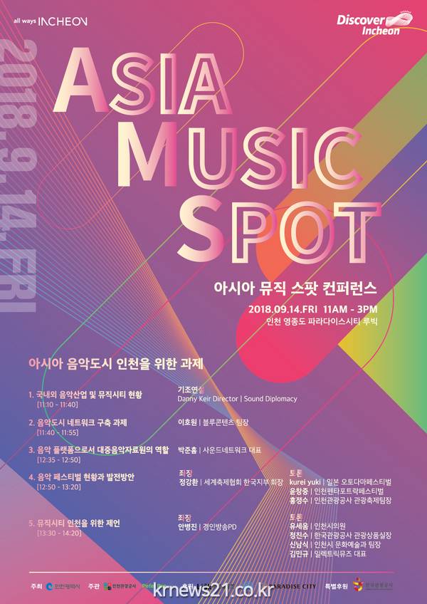 인천광역시(시장 박남춘)와 인천관광공사는 9월 14일(금), 영종 파라다이스 시티에서 ‘아시아 음악도시 인천을 위한 과제’를 주제로“2018 아시아 뮤직 스팟(ASIA MUSIC SPOT)”행사를 개최한다고 전했다.