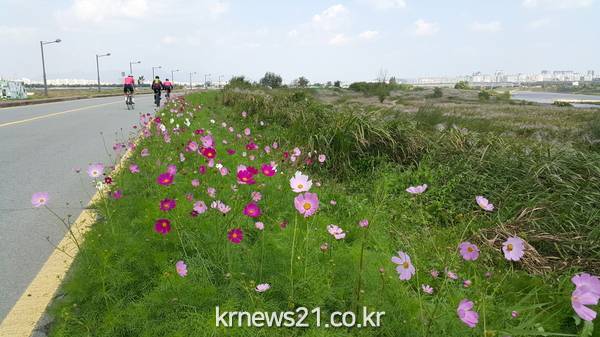 이 구간은 광주광역시 푸른도시사업소가 지난 7월부터 제방 갓길에 코스모스 종자를 파종한 곳으로, 폭염을 이겨내고 꽃길을 연출하고 있다.