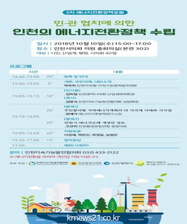 인천광역시(시장 박남춘)는 10월 10일 인천지속가능발전협의회와 함께 인천의 에너지전환정책의 시민참여 및 민·관 협치 구축 방향과 지방정부의 역할을 모색하기 위한 ‘제2차 에너지전환’정책 포럼이 인천광역시의회에서 개최된다고 밝혔다.