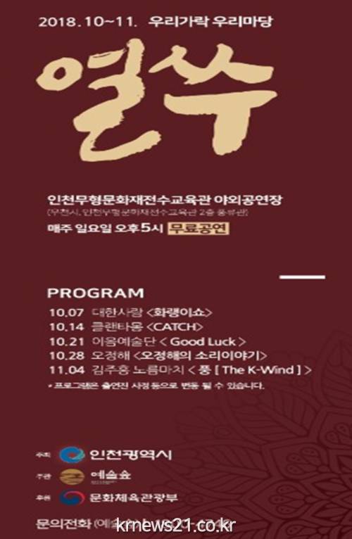 인천시는 5월부터 인천무형문화재 전수교육관 야외공연장에서 매주 일요일 오후5시 일요상설공연 우리가락 우리마당“얼쑤”공연을 개최하고 있다.