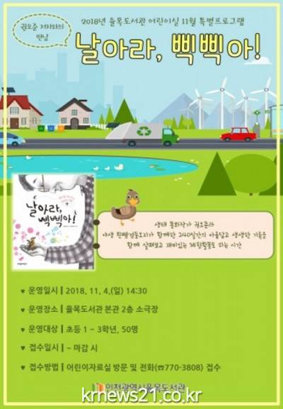 인천광역시가 설립하고 인천광역시도서관발전진흥원이 운영하는 율목도서관(관장 김태경)이 지역사회와 함께하는 도서관상 정립을 위해 초등 1~3학년을 대상으로 생태 동화작가 권오준과 함께하는 ‘날아라, 삑삑아!’ 특별프로그램을 운영한다고 밝혔다.