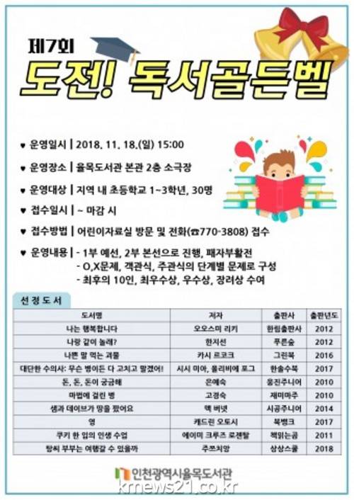 인천광역시가 설립하고 인천광역시도서관발전진흥원이 운영하는 율목도서관(관장 김태경)은 지역 학생들에게 폭넓은 독서경험을 제공하고 도서관 이용의 생활화를 유도하기 위해 ‘제7회 도전! 독서골든벨’ 대회를 11월 18일 오후 3시 율목도서관 본관 2층 소극장에서 개최한다고 밝혔다.
