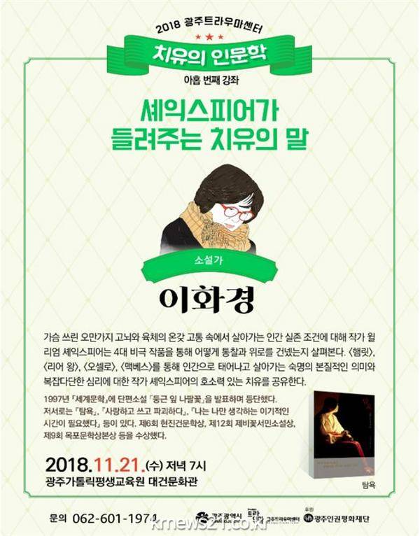 이 날 강연을 맡은 소설가 이화경 씨는 ‘셰익스피어가 들려주는 치유의 말’을 주제로 고뇌와 고통 속에서 살아가는 인간 조건에 대해 작가 윌리엄 셰익스피어는 어떤 위로를 건넸는지, 그의 4대 비극 작품을 통해 살펴볼 예정이다.
