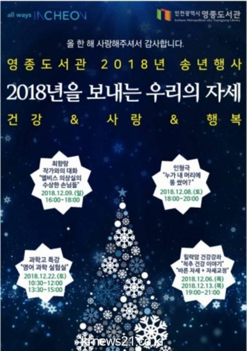 인천광역시가 설립하고 인천광역시도서관발전진흥원이 운영하는 영종도서관(관장 배창섭)은 2018년 12월 맞이하여 ‘2018년을 보내는 우리의 자세: 건강, 사랑, 행복’을 주제로 6개 독서·문화행사를 진행한다.