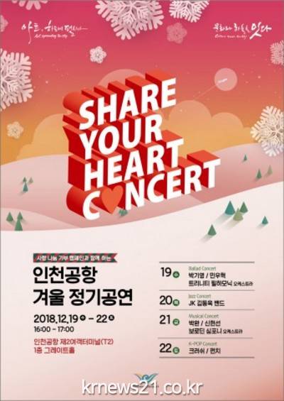 인천국제공항(사장 정일영)이 연말을 맞아 추운 겨울을 따뜻하게 만들어 줄 겨울 정기공연 ‘SHARE YOUR HEART CONCERT’를 19일부터 22일까지 4일 간 제2여객터미널 1층 그레이트홀에서 개최한다.