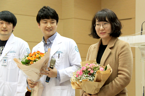각과 주임과장, 선배 의사들도 꽃다발 선물로 이들을 격려하고 직원들은 ‘당신은 사랑받기 위해 태어난 사람’을 합창으로 환영의 마음을 전달했다.