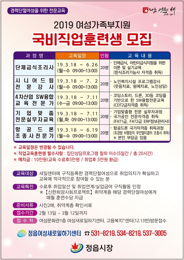 이와 관련 자세한 사항은 정읍여성새로일하기센터(063-534-8219)로 문의하면 된다.