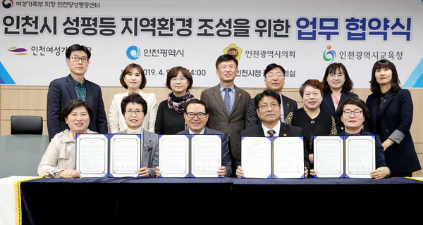 인천여성가족재단(대표이사 원미정)은 4월 9일(화) 인천시청 공감회의실에서 인천시, 인천시의회, 인천시교육청과‘인천시 성평등 지역환경 조성을 위한 업무협약’을 체결했다.