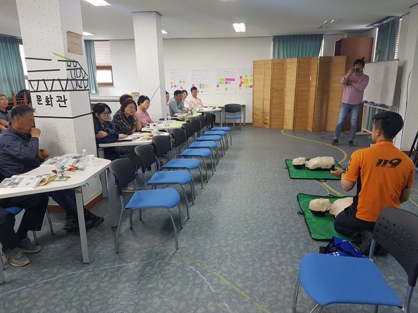 이날 교육은 마을활동가 20명을 대상으로 심정지 환자 발생 또는 일상생활에서 일어날 수 있는 사고와 화재상황 발생 시 대처능력을 향상하기 위해 마련되었다.