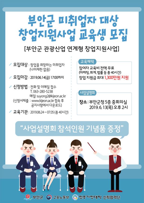 이번 사업은 부안군과 고용노동부가 주관하고 전주기전대학이 수행하는 지역산업 맞춤형 인력양성 사업으로 나이에 상관없이 창업을 희망하는 군민을 대상으로 세무, 회계, 창업 멘토링 등 창업교육 및 창업지원을 진행할 예정이며 오는 6월 14일까지 신청을 받아 8명을 선발할 예정이다.