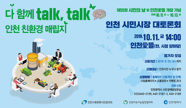 ○ 인천시(시장 박남춘)와 인천사랑운동시민협의회 그리고 인천지속가능발전협의회가 공동 주최하는 ‘인천 시민시장 대토론회’가 오는 10월 11일 인천시청 앞마당인 인천애(愛)뜰에서 개최된다고 밝혔다.