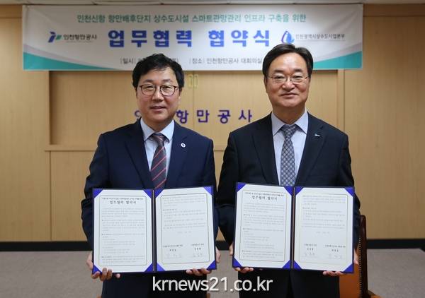 ○ 인천시 상수도사업본부(본부장 박영길)와 인천항만공사(사장 남봉현)는11월 7일 인천항만공사 대회의실에서 ‘인천신항 스마트관망관리 인프라 구축 업무협약’을 체결하였다.