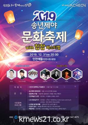 '2019 인천 송년 제야 문화축제는" 오는 31일 오후 8시부터다. 첫 무대는 장애인예술단체 라온제나 오케스트라와 국악 박규희 명창, 인천시 홍보대사이자 트롯가수인 오예중·오세아 등 인천지역 예술인의 공연이다. 이어 특유의 서정적 음색을 지닌 싱어송라이터 김필, 브이오에스(V.O.S) 박지헌, 6인조 걸그룹 바바(BABA)의 화려하고 멋진 무대가 기다리고 있다.