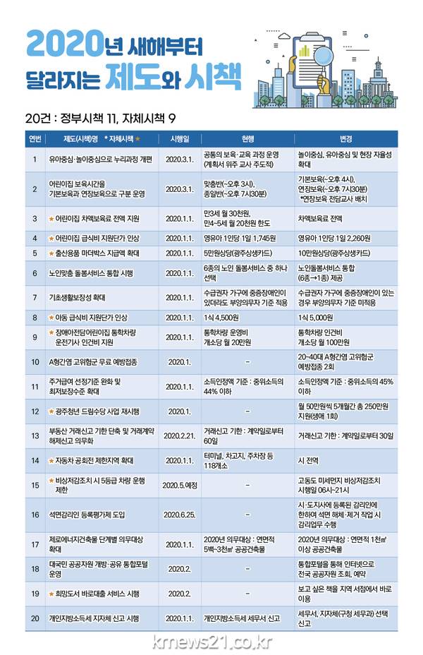 광주광역시는 2020년부터 복지를 비롯한 경제, 환경, 문화 등 5개 분야 총 20건의 제도와 시책이 새로 시행되거나 달라진다고 밝혔다.