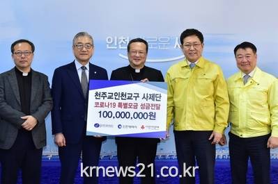 인천시(시장 박남춘)는 23일 천주교 인천교구 사제단이 코로나19 극복을 위해 모금한 성금을 인천사회복지공동모금회(회장 정명환)에 기탁하였다고 밝혔다. 인천교구 사제단은 총 2억원을 모금하여 1억원은 인천에 기탁하고 1억원은 대구교구를 통하여 대구지역에 기탁한다.