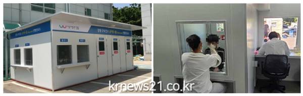 이번에 설치한 이동형 선별진료소는 음압장비가 설치된 3개의 검체 채취실과 접수 공간 4곳으로 구성됐다. 검체 채취실은 투명 아크릴 벽을 설치해 의료진과 검사 대상자 사이 공간을 분리하고, 뚫린 공간의 비닐장갑으로 손을 넣어 검사 대상자의 검체를 채취하는 ‘글로브월(Glove Wall)’ 방식의 시설이다.