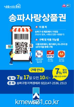 송파구(구청장 박성수)가 다양한 사용처로 구민들에게 큰 인기를 얻었던 지역화폐 ‘송파사랑상품권’을 오는 7월 17일 3차 발행한다고 밝혔다.