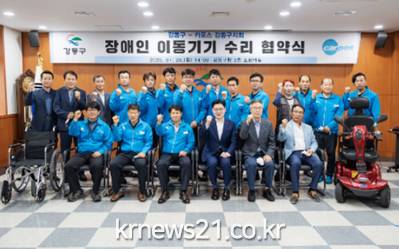 구는 지난 20일(월) 구청 3층 소회의실에서 자동차전문정비조합 카포스 강동구지회(지회장 김경천)와 ‘장애인 이동기기 수리 협약’을 맺고 장애인 복지증진에 힘을 모으기로 했다.