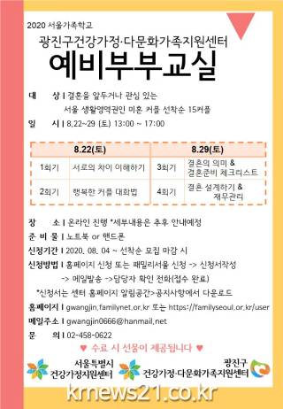 이와 함께 오는 22일과 29일 광진구건강가정·다문화가족지원센터에서 예비부부의 행복한 첫걸음을 지원하기 위한 ‘온라인 예비부부교실’을 운영한다.
