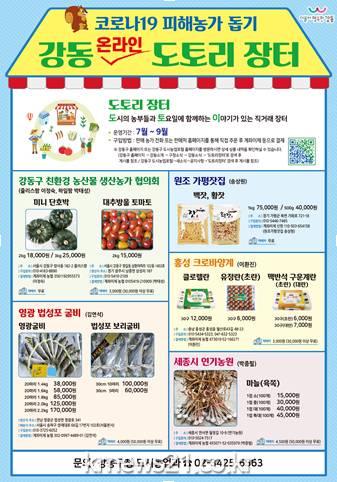 강동구(구청장 이정훈)는 7월부터 9월까지 신종 코로나바이러스 감염증(코로나19)으로 어려움을 겪고 있는 농가를 돕고 소비자에게 우수한 먹거리를 제공하기 위해 농산물 직거래장터인 ‘온라인 강동 도토리장터’를 개최한다.