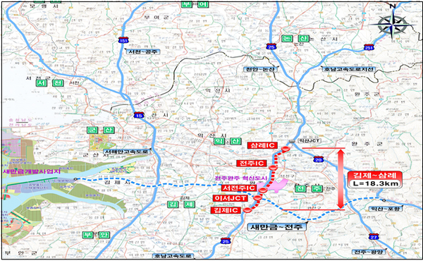 호남고속도로 확장사업은 제1차 고속도로 건설 계획(’16~‘20)에 중점추진 사업으로 반영되어 익산시 왕궁면(삼례IC)에서 김제시 금구면(김제IC)까지 18.3km구간에 총사업비 2,315억원을 투자하여 기존 왕복 4차로를 6차로로 확장하는 사업이며