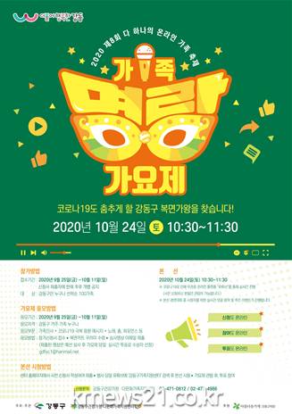 구는 지난 9월 25일부터 10월 11일까지 가요제 참가 사전 신청을 받았으며 가족들이 직접 노래, 춤, 퍼포먼스 등을 펼치며 코로나19 극복메시지를 각자의 방식으로 표현한 영상 40점이 접수됐다. 이 중 최종 본선에 오른 10가족의 영상이 오는 24일 오전 10시 30분부터 온라인 플랫폼에서 펼쳐진다.